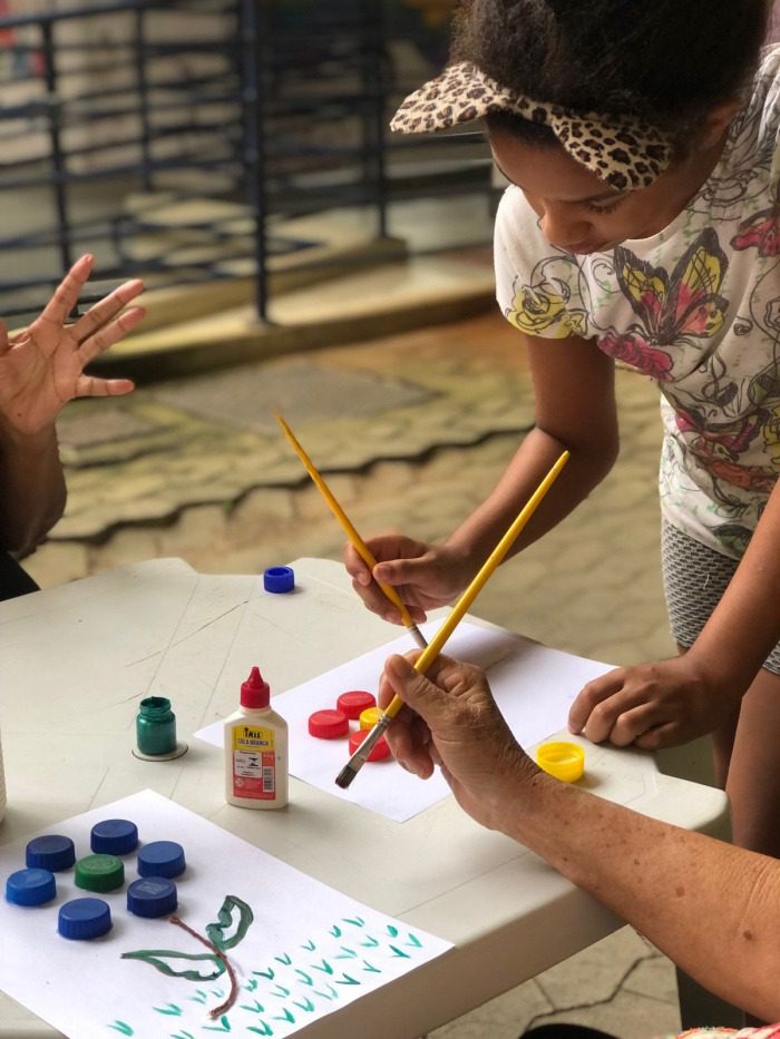 Ana Clara de Paula, de 10 anos, e a dona Cecília Rosa da Conceição, de 65 anos, formaram uma dupla quase que inseparável na oficina de artes. Emocionada com o carinho entre as duas, Ana Clara disse que “foi bem legal e apropriado brincar com os idosos. É uma experiência nova para elas”. E, dona Cecília, respondeu que sim.