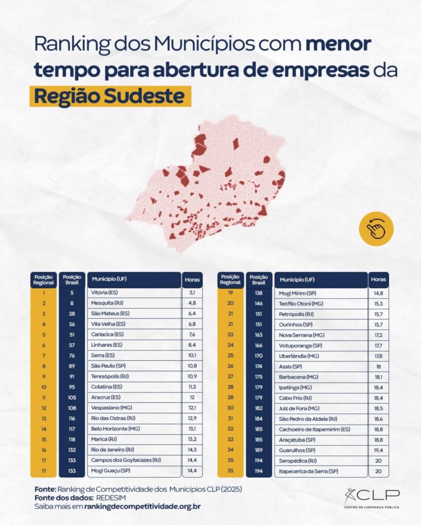 122Vitória, capital do Espírito Santo, conquistou o 1º lugar da Região Sudeste no indicador que mede o tempo médio para abertura de empresas, de acordo com dados do Ranking de Competitividade dos Municípios, elaborado pelo Centro de Liderança Pública (CLP).