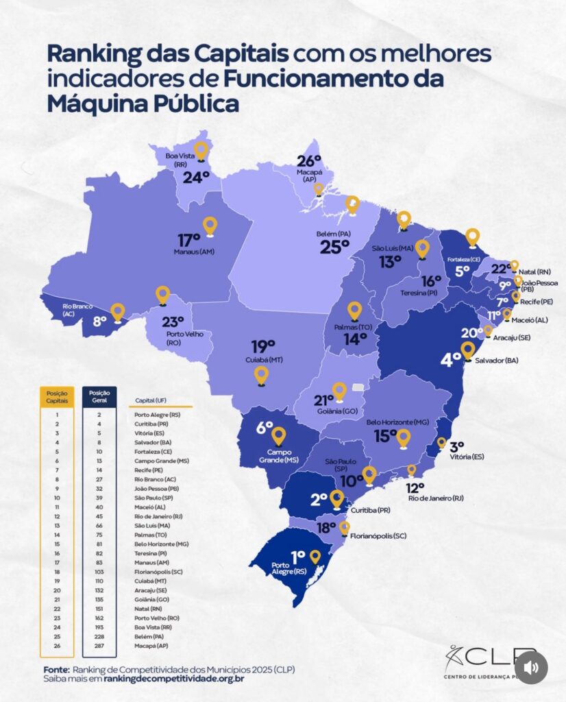Vitória é primeiro lugar no Sudeste, entre as capitais, no funcionamento da máquina pública, de acordo com o Ranking de Competitividade dos Municípios, do Centro de Liderança Pública (CLP).